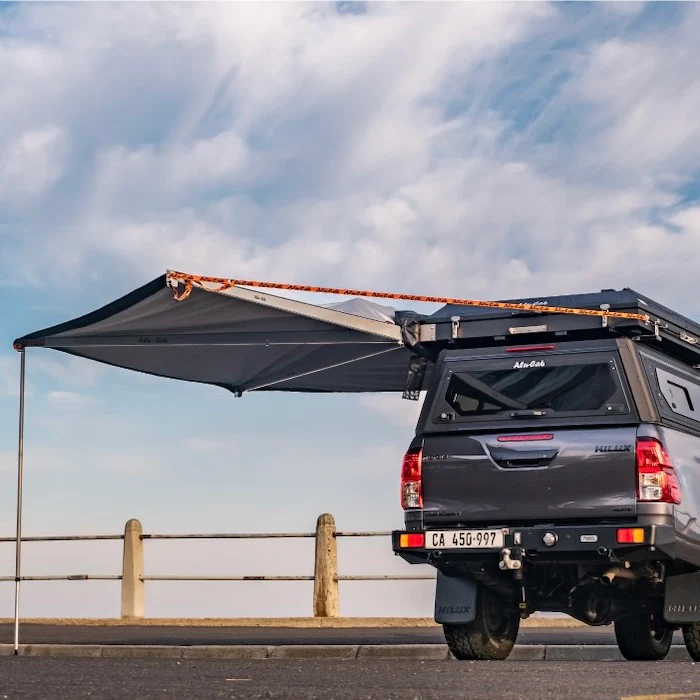 Introducing a new awning to the Alu-Cab Shadow Awning range, the 180° Shadow Awning. Once open this free standing awning folds out to be parallel with your vehicle, allowing access to the rear of your vehicle, where your drawer system, fridge, and supplies are stored. There are no additional steps or poles to pitch; you just unzip the bag and swing the awning through a 180º. It’s so easy, one person can manage it.